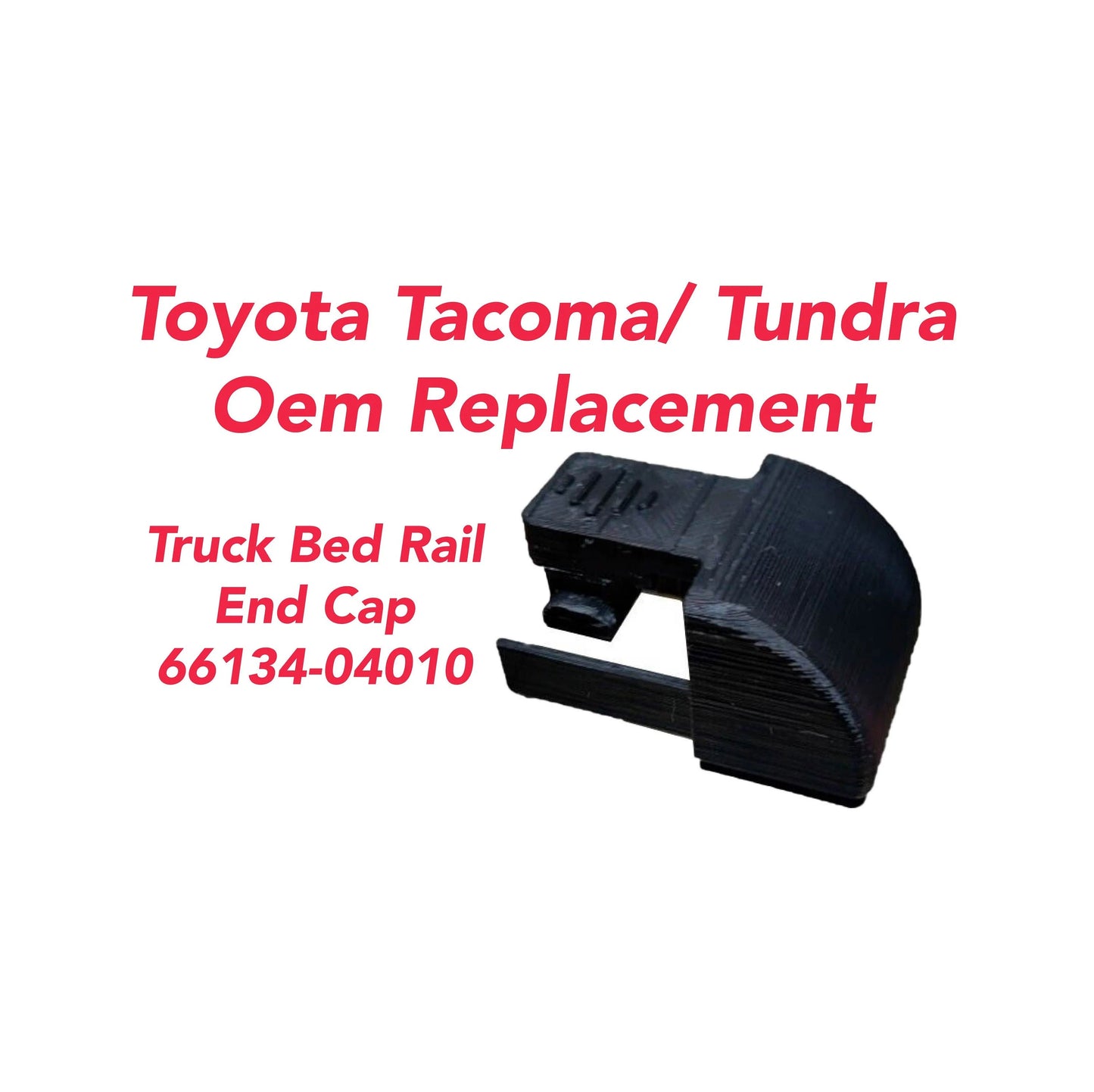 This 3D printed replacement Toyota Tacoma bed rail end cap is constructed of durable plastic and designed to fit precisely into the original bed rail end cap slots. Providing a secure fit and reliable performance, this replacement part is expertly manufactured to OE OEM specifications.